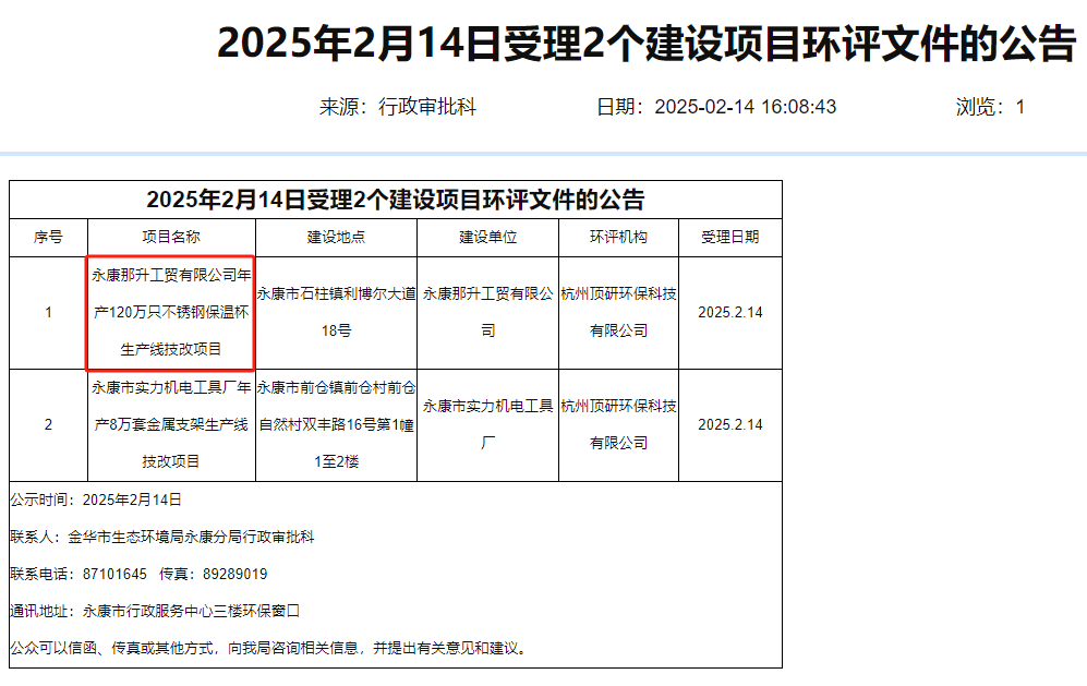 2025年2月14日,金華市生態(tài)環(huán)境局永康分局受理永康那升工貿(mào)有限公司年產(chǎn)120萬(wàn)只不銹鋼保溫杯生產(chǎn)線技改項(xiàng)目環(huán)境評(píng)價(jià)報(bào)告表并對(duì)外進(jìn)行公示。
